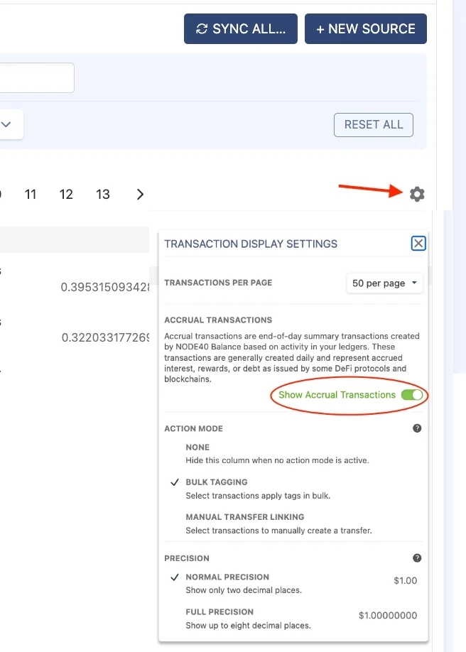 You can find the staking rewards in our NEW Accrual Transactions feature. Accrual transactions are end-of-day summary transactions created by NODE40 Balance based on activity in your ledgers. These transactions are generally created daily and represent accrued rewards such as staking rewards. To utilize this new feature, users will need to toggle the visibility of these transactions by navigating to the cogwheel in the upper right of the timeline transaction table. From there, toggle the switch to “Show Accrual Transactions.” NODE40 Balance will update, and if accrual transactions are applicable to any ledgers in your portfolio, you’ll now see a record of such transactions. If you have questions about this feature, please don’t hesitate to contact NODE40 Support.