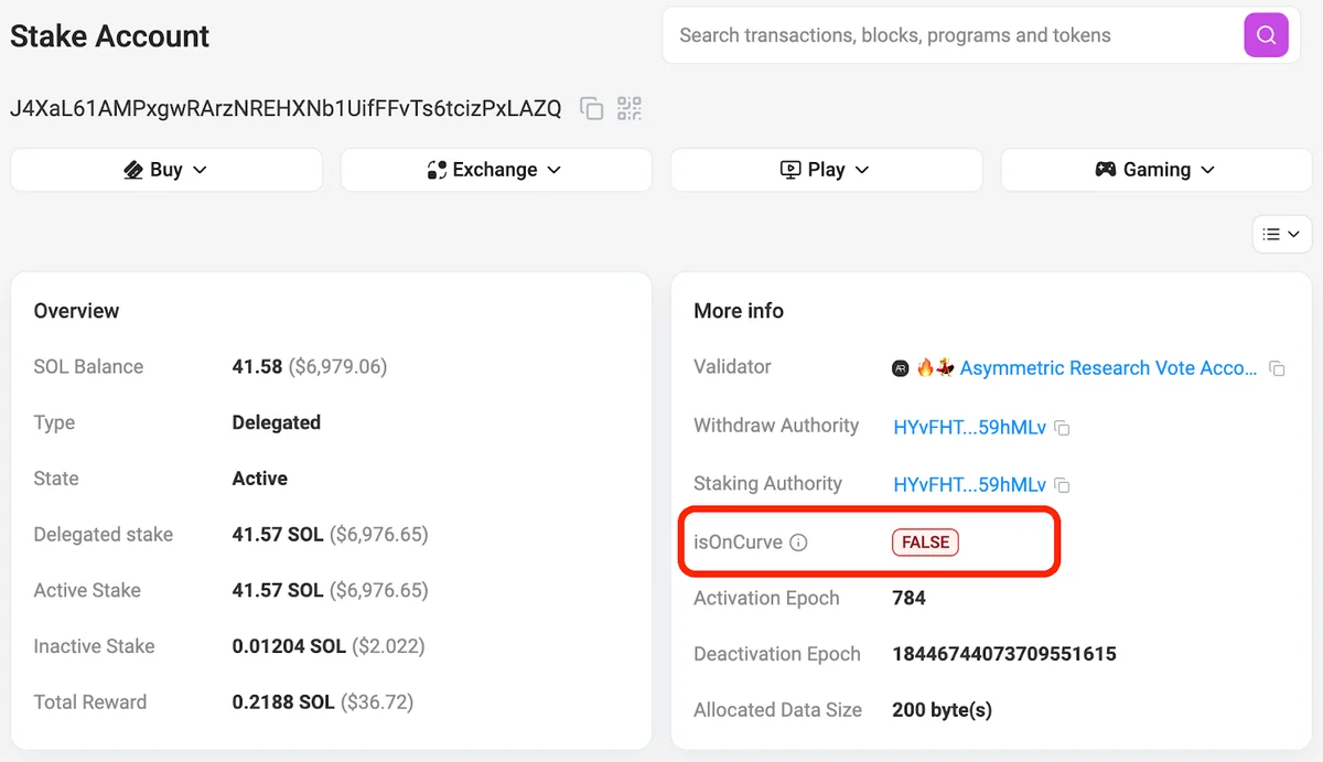 Once the transaction is finalized, the account is fully initialized and the System program can no longer mutate or close it. All future operations (delegateStake, split, withdraw, etc.) must be authorized by the embedded authority keys, not by the stake account’s own private key. In fact, the original keypair can be, and typically is, destroyed by the client at this point. If you view the account in Solscan, you will see FALSE for isOnCurve (indicating that the account has no private key that can sign). See below.