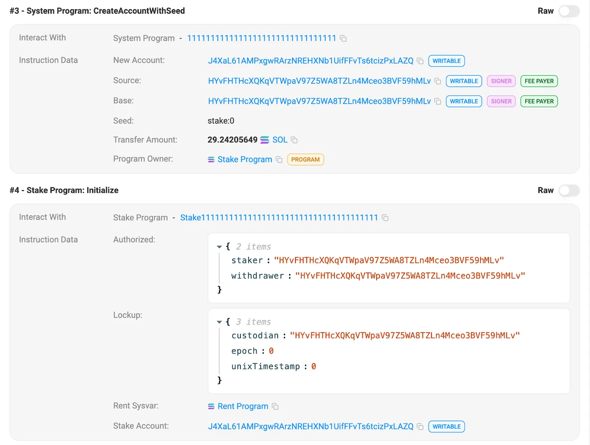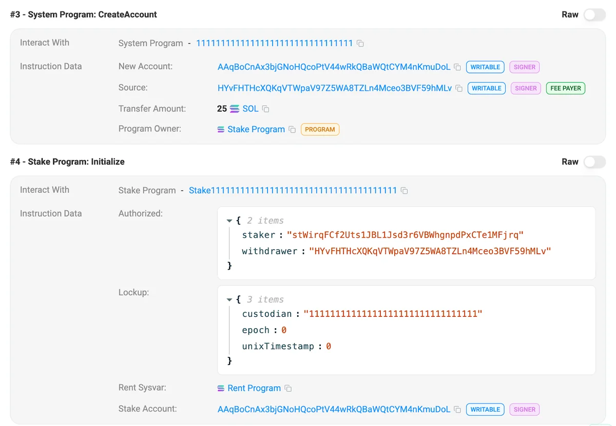 CreateAccount and Initialize instructions for stake account AAqBoCnAx3bjGNoHQcoPtV44wRkQBaWQtCYM4nKmuDoL.In Figure 2 above, instruction #3 shows the account being created by HYvFHTHcXQKqVTWpaV97Z5WA8TZLn4Mceo3BVF59hMLv and seeded with 25 SOL. Instruction #4 shows HYvFHTHcXQKqVTWpaV97Z5WA8TZLn4Mceo3BVF59hMLv assigned as the withdraw authority but stWirqFCf2Uts1JBL1Jsd3r6VBWhgnpdPxCTe1MFjrq (Marinade Native Staking) assigned as the stake authority.