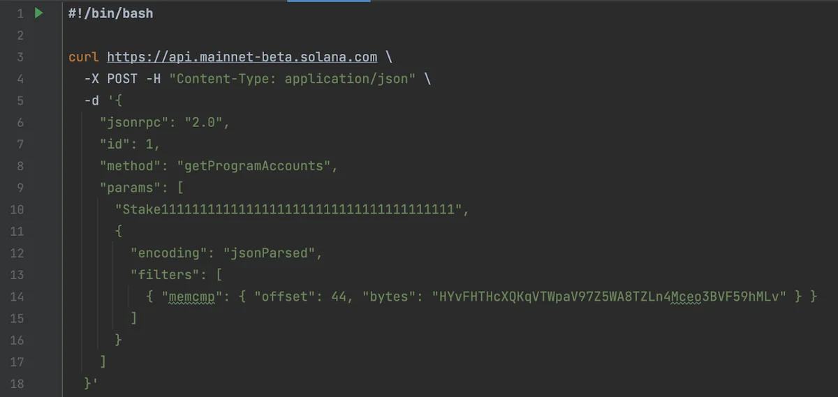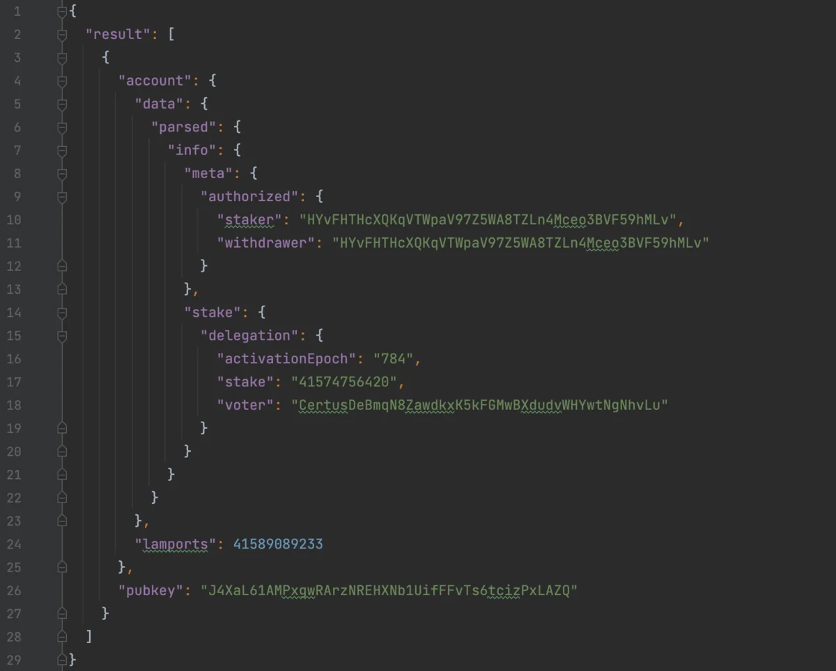 Figure 4 shows the single active stake account for HYvFHTHcXQKqVTWpaV97Z5WA8TZLn4Mceo3BVF59hMLv. It is the JSON representation of what you would see in Solscan’s “Stake Accounts” tab5.