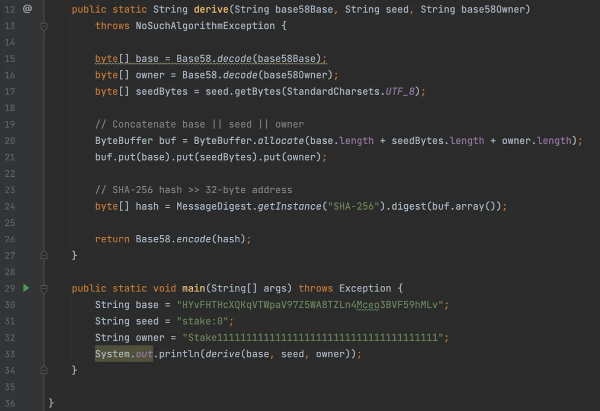Figure 7 shows how to derive a stake account pubkey that was created with CreateAccountWithSeed. The algorithm is simple and shows it is deterministic if you know the base and seed (owner for stake is the Stake Program). Does this mean I can do this for stake:1, stake:2, stake:3, etc? Yes, it does. However, that pattern isn’t a standard. The seed is up to the client. It just so happens that this client used an obvious pattern7.