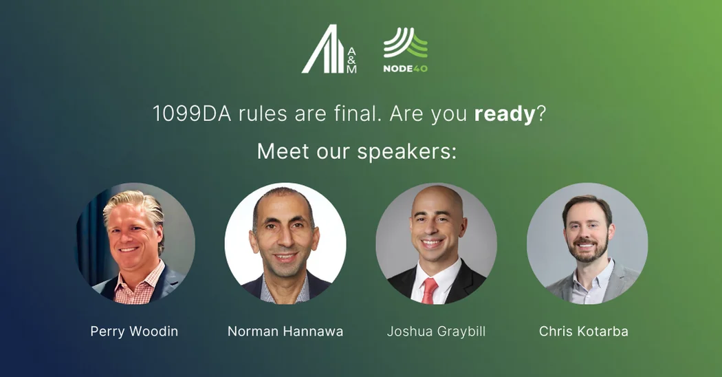 Description: We are excited to announce an upcoming webinar in partnership with Alvarez & Marsal, where we will delve into the latest 1099-DA regulations. This session will cover the final regulations and demonstrate how NODE40’s data solutions can assist brokers in navigating these changes. Join Perry, Norm, Chris and Josh as they highlight these updates and discuss their implications.